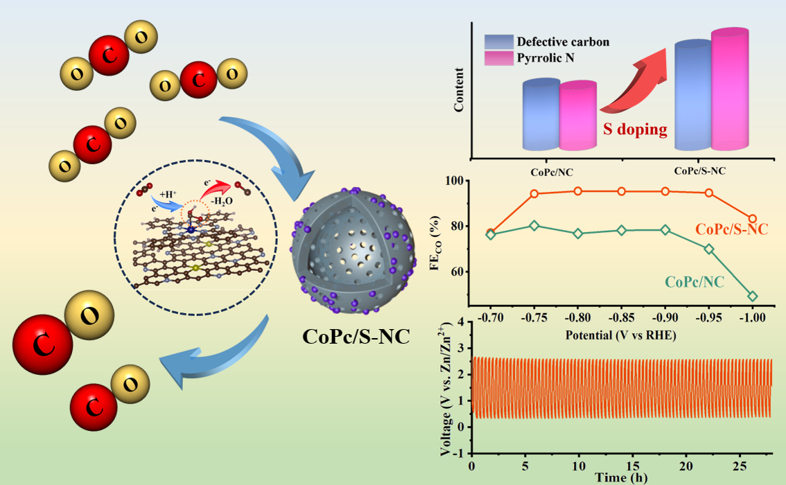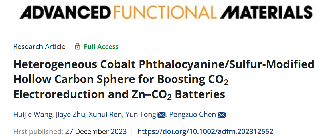 近日,学校化学与化工学院陈鹏作研究员课题组在国际知名期刊《Advanced Functional Materials》上发表题为“Heterogeneous Cobalt Phthalocyanine/Sulfur-Modified Hollow Carbon Sphere for Boosting CO2Electroreduction and Zn–CO2Batteries”的文章。该文以酞菁钴(CoPc)为概念例,提出了一种以中空碳球(S-NHC)为载体的S原子掺杂策略,揭示了Co单原子的微环境调控与催化活性之间的内在关系。其中,硕士研究生王慧杰为第一作者,陈鹏作研究员和童赟副教授为共同通讯作者,我校为唯一通讯单位。该工作受到国家自然科学基金及浙江省自然科学基金的资助。