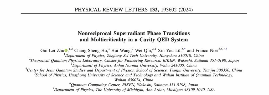 近日,我校理学院青年教师朱贵蕾博士在国际物理学顶级期刊Physical Review Letters发表了题为 “Nonreciprocal Superradiant Phase Transitions and Multicriticality in a Cavity QED System” 的研究论文。朱贵蕾博士是论文的第一作者,浙江理工大学理学院为第一署名单位,华中科技大学的吕新友教授和日本理化学研究所的Franco Nori教授为共同通讯作者。该工作受到科技部国家重点研发计划(2021YFA1400700)的资助。