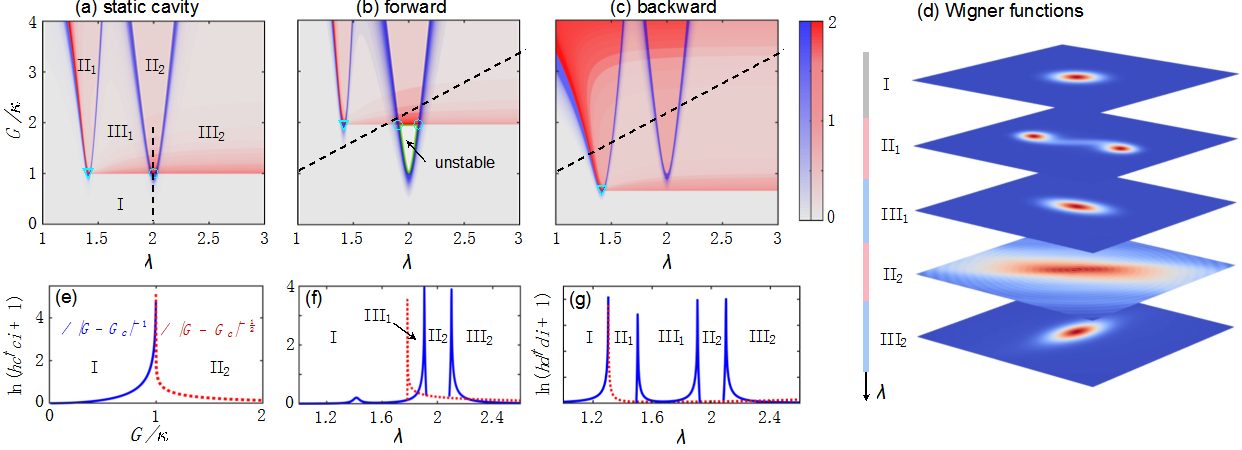 图1: 全光操控的非互易超辐射相变和多临界现象(相图中三角形表示三相点,圆圈表示多临界点)