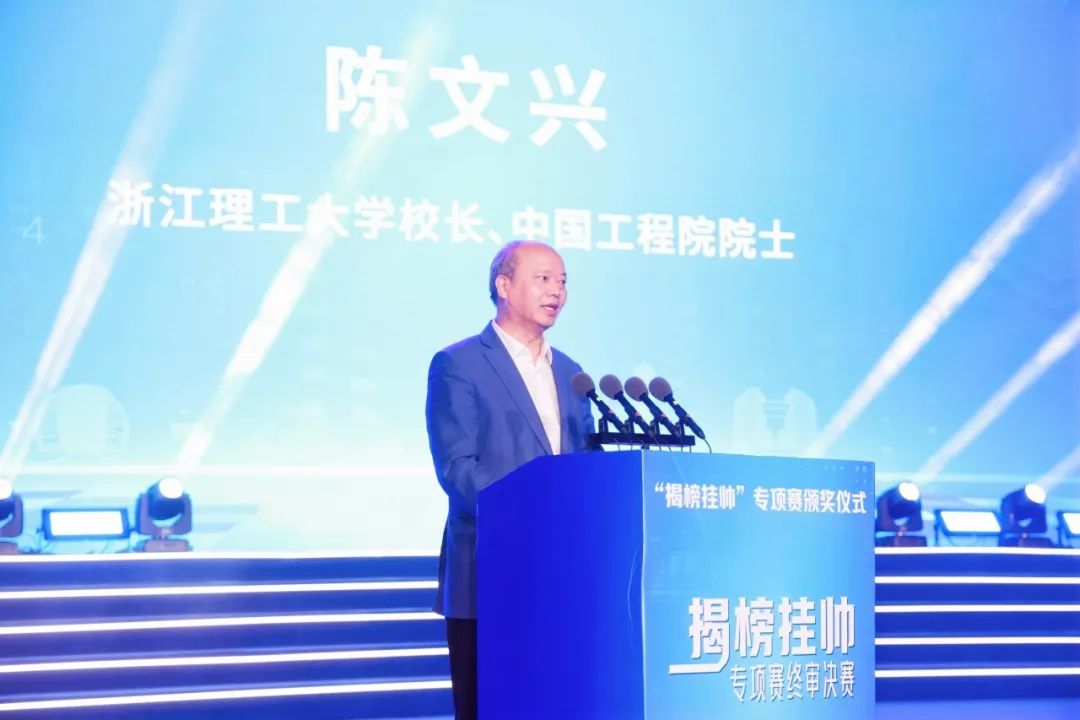 中国工程院院士、浙江理工大学校长陈文兴在会上致辞。陈文兴表示,“揭榜挂帅”专项赛聚焦前沿科技领域,在国家关键核心技术攻坚战中,吹响了青春冲锋的号角,希望广大青年自信自强、敢闯会创,加快成长为具有家国情怀、国际视野、跨界融合的创新创意创业卓越人才。浙江理工大学将以承办本次比赛为契机,建立赛事成果项目孵化器,为创新创业人才培养、科技企业培育孵化、服务产业创新提供有力支撑。