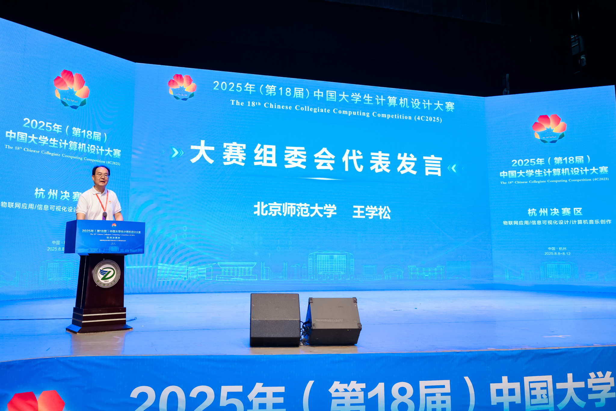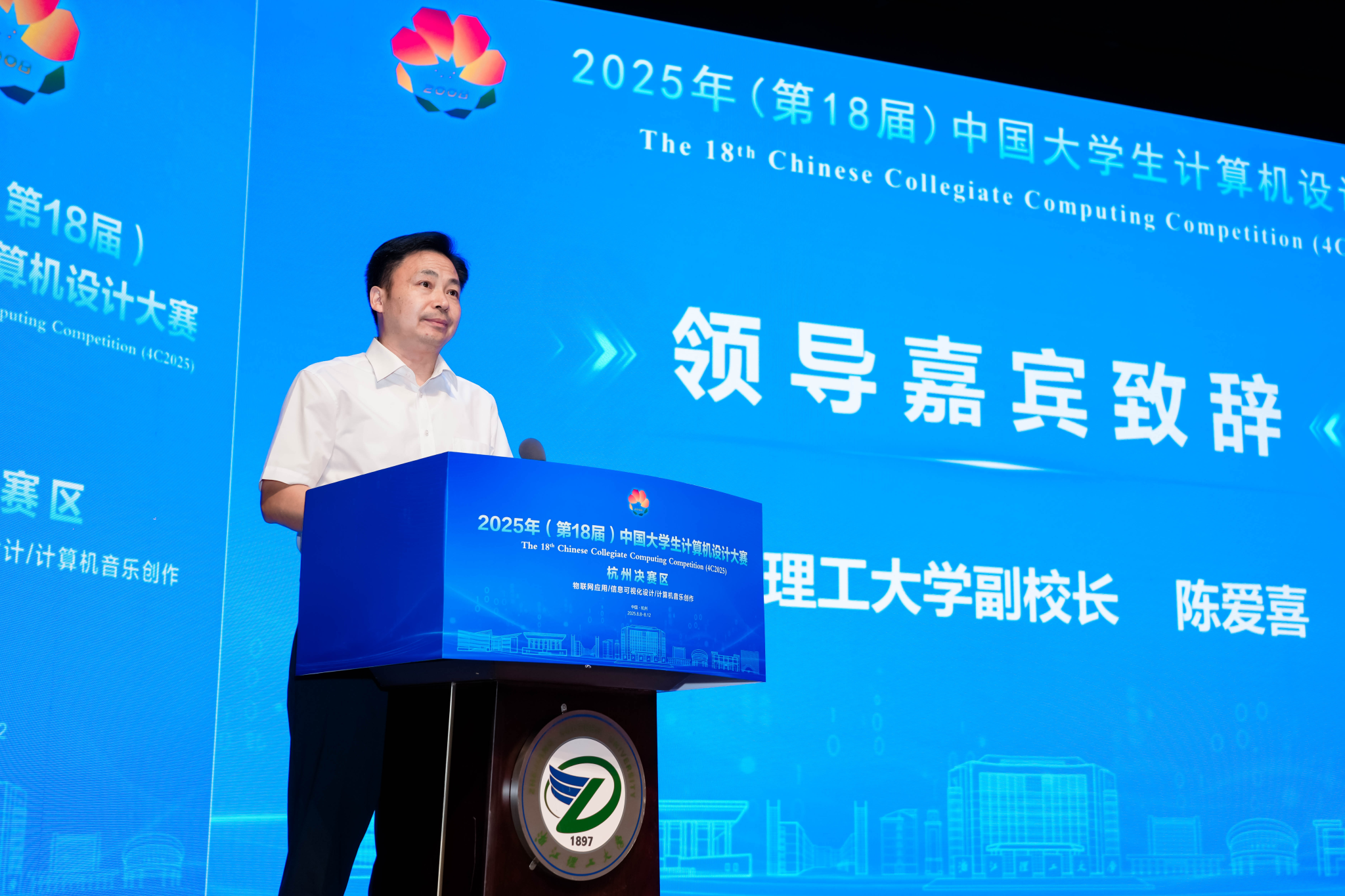 陈爱喜致辞,他表示,本次杭州赛区决赛圆满落幕,2600余名师生用代码书写青春、用创意点亮未来,生动诠释了当代大学生“敢闯会创”的精神风貌。学校向所有参赛者、评委、志愿者及合作伙伴表示衷心感谢,并将持续为青年学子搭建成长平台,携手全国高校共同谱写新时代创新人才培养的新篇章。