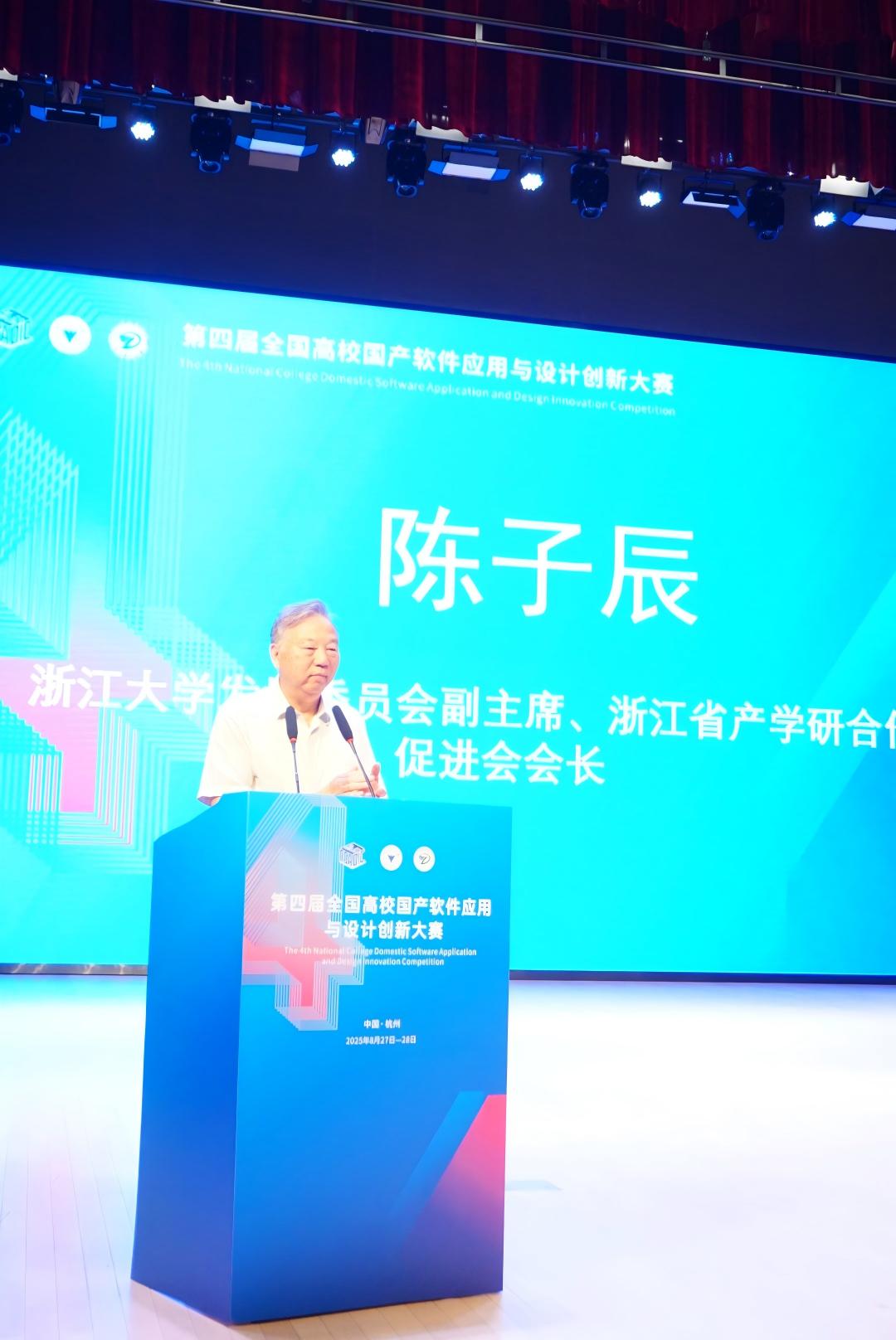浙江大学发展委员会副主席、浙江省产学研合作促进会会长陈子辰教授致辞,他指出,大赛旨在进一步激发高校学生的创新热情和实践能力,推动国产软件在教育教学、科研攻关、产业应用中的深度融合。希望参赛队伍敢闯敢创,把科研的热情和解决问题的实践能力结合起来;希望高校的智慧能更多走进产业,企业的需求能更多进入校园;希望与会者共同营造鼓励探索,宽容失败,支持创新的氛围,为推动国产软件高质量发展、建设科技强国作出新的更大贡献。