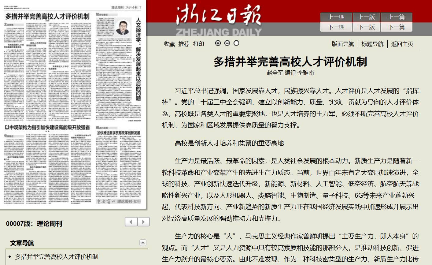 1月20日,《浙江日报》理论版头条刊发浙江理工大学党委书记赵全军理论文章《多措并举完善高校人才评价机制》。
